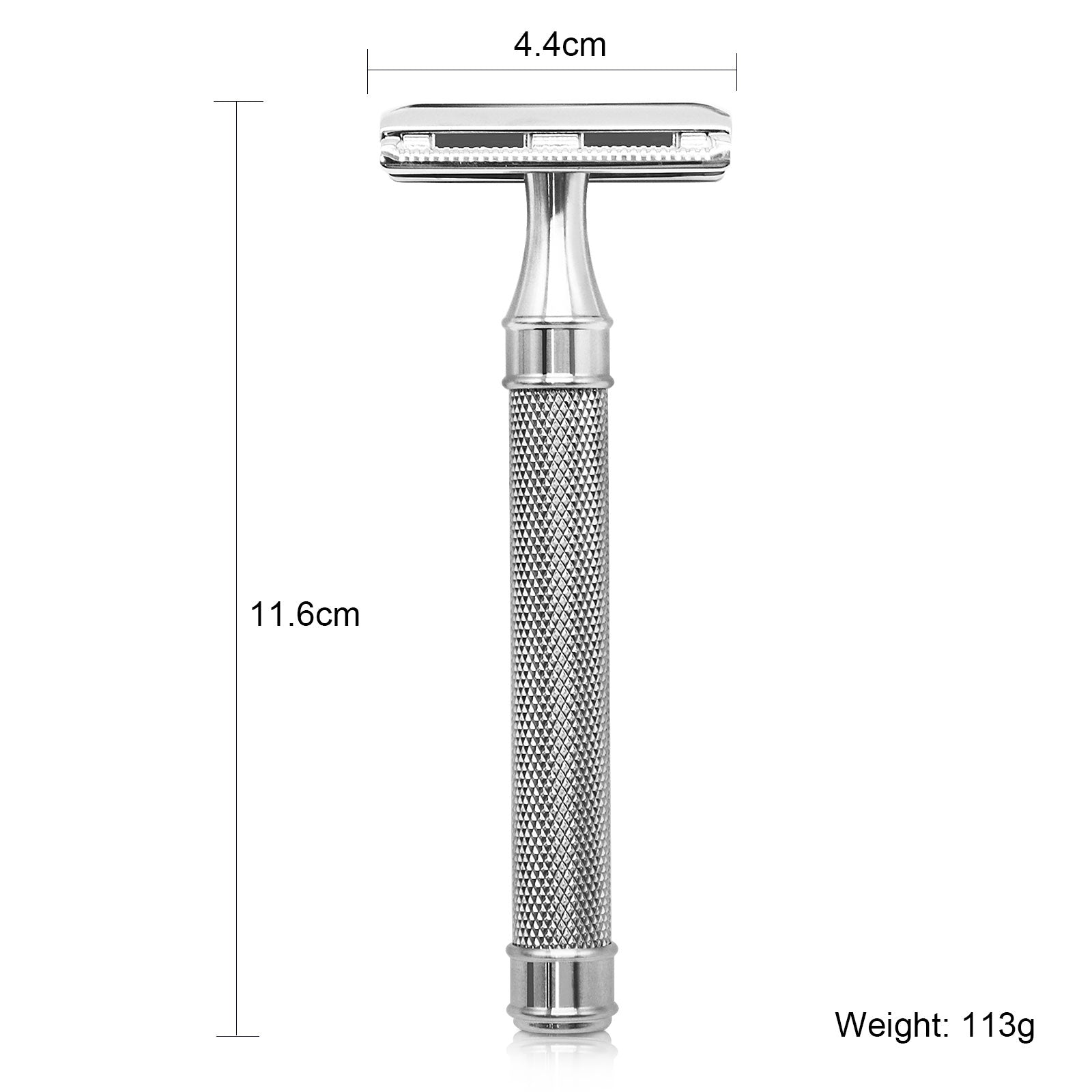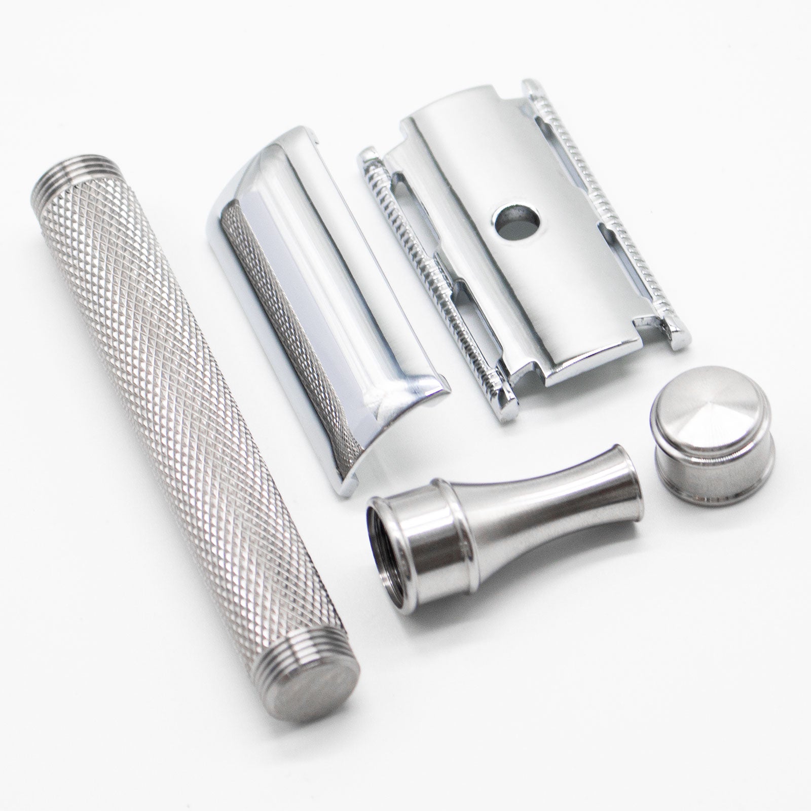The closed comb head is expertly engineered and is finished with high-quality stainless steel plating. The razor is laser etched onto the head. The Handle is shaped for ultimate comfort in the hand. Checkered knurling for superior grip! You will be proud to pick this razor up and shave with it, and you will be supremely impressed with the result!