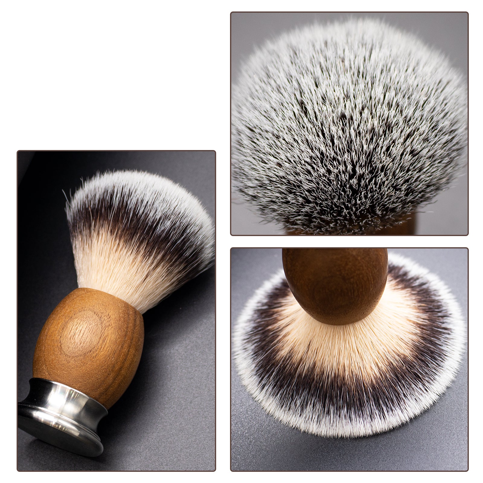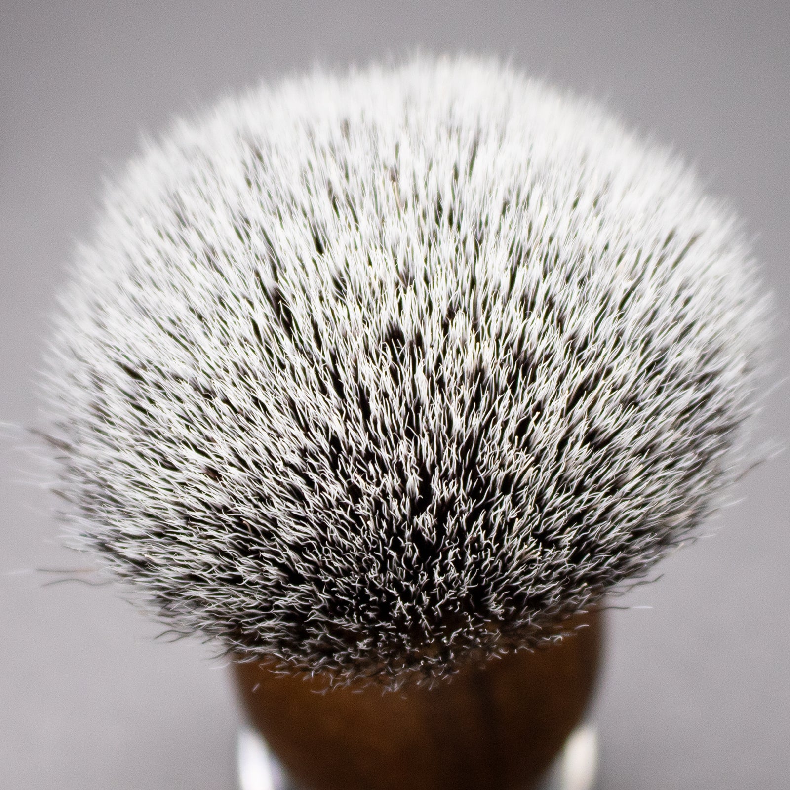 We've loaded this brush with top-end nylon hair, new fiber that is taking the shaving world by storm. One of the first to truly rival badger hair for comfort and performance, it is cruelty-free and lower cost than badger. The soft top-end nylon hair have a fantastic face-feel and whip up an exceptional lather. But they still have an firm backbone, so (unlike other synthetics) they work as well on soaps as they do on creams and lasts for a long time, almost no hair loss.