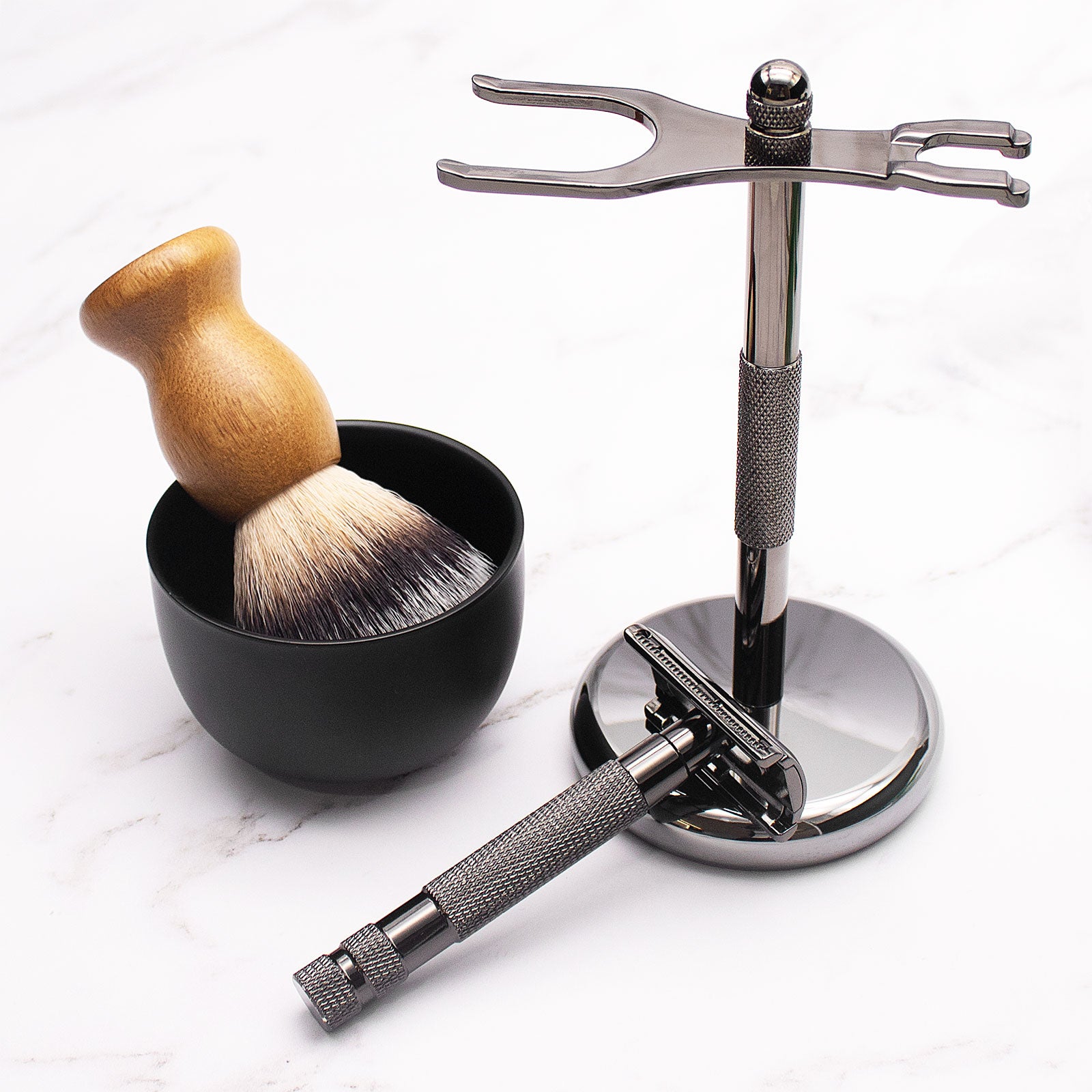 Featuring the popular Great Gentleman Black Razor and matching shaving brush, the set is completed with a matching chrome-plated display stand.